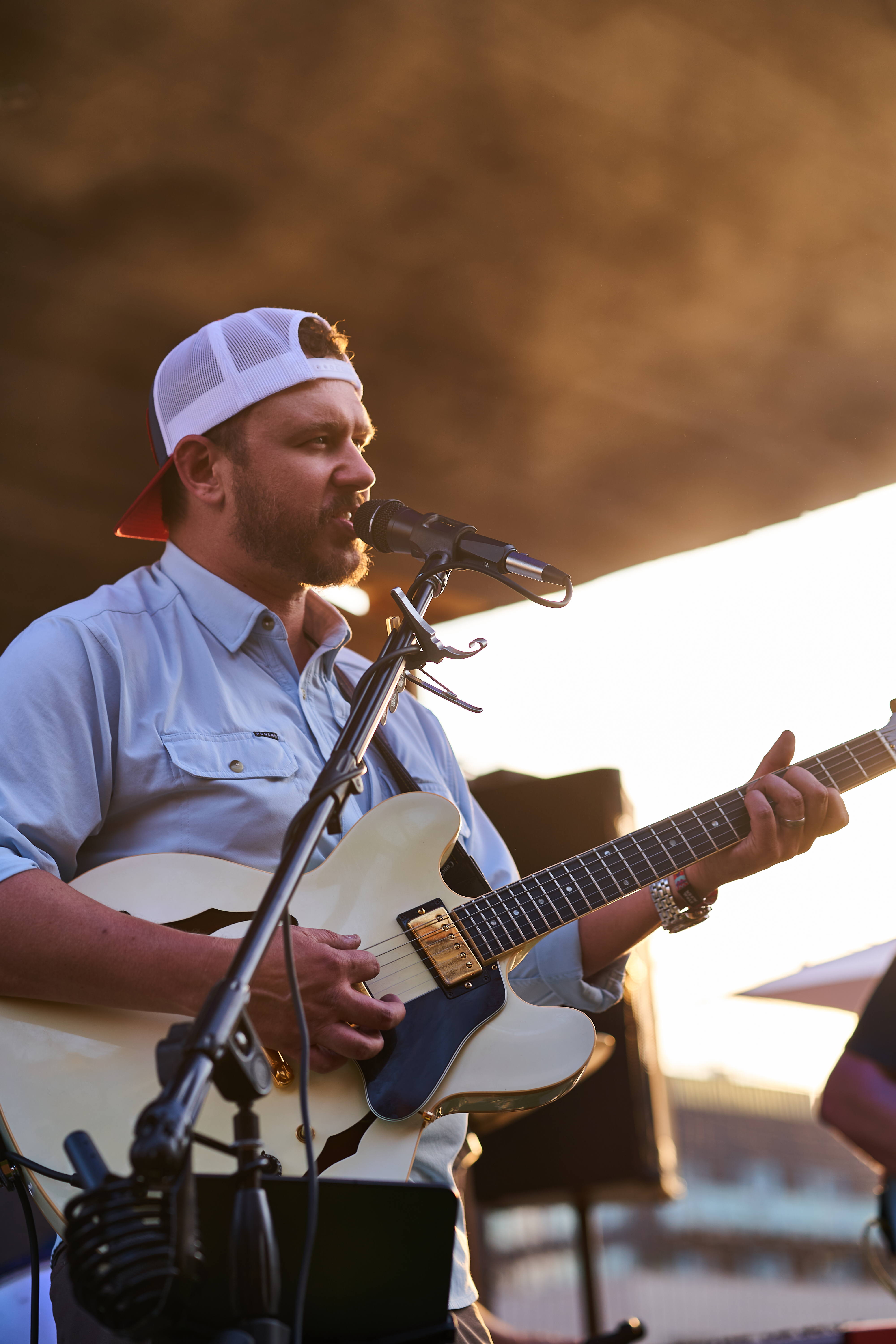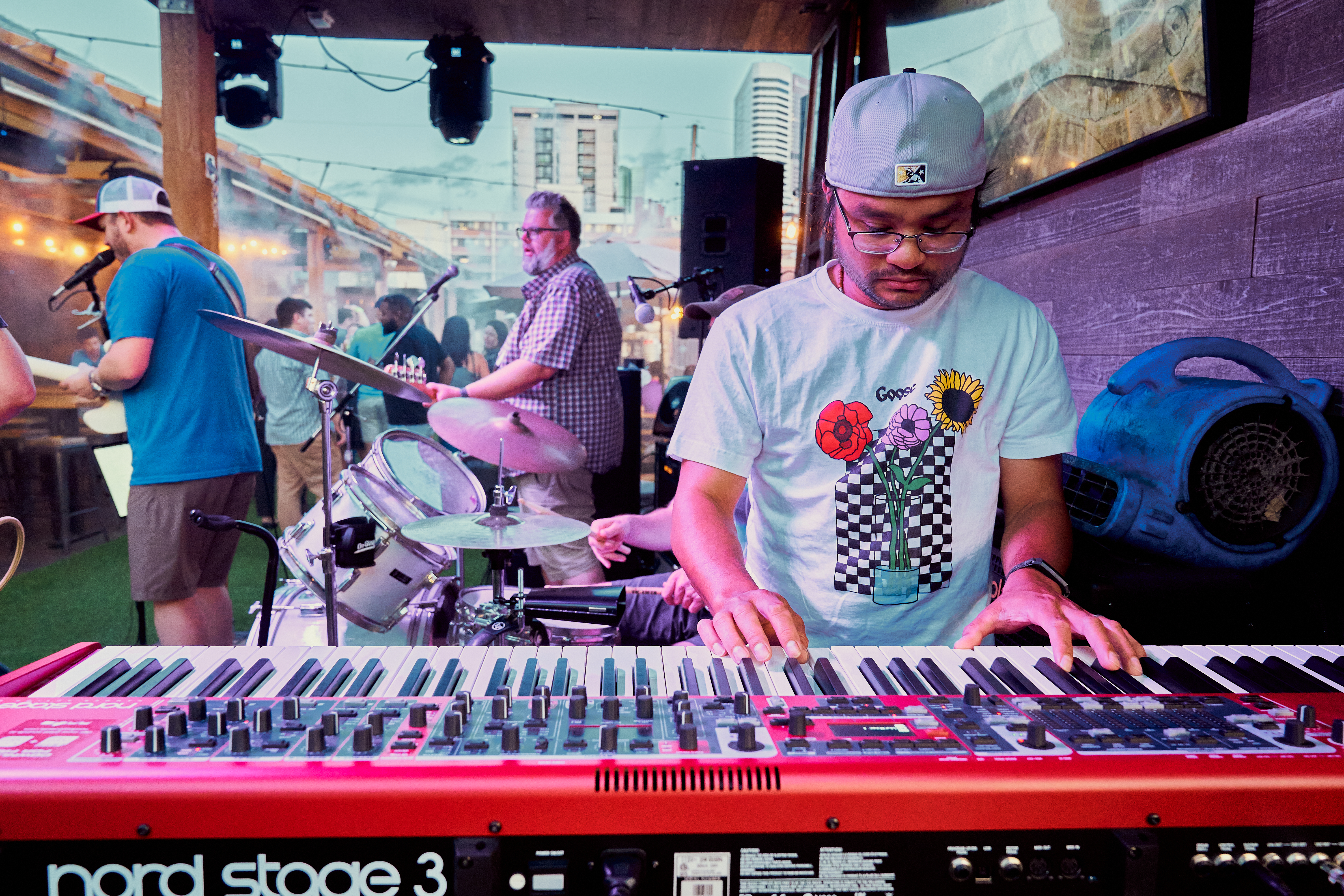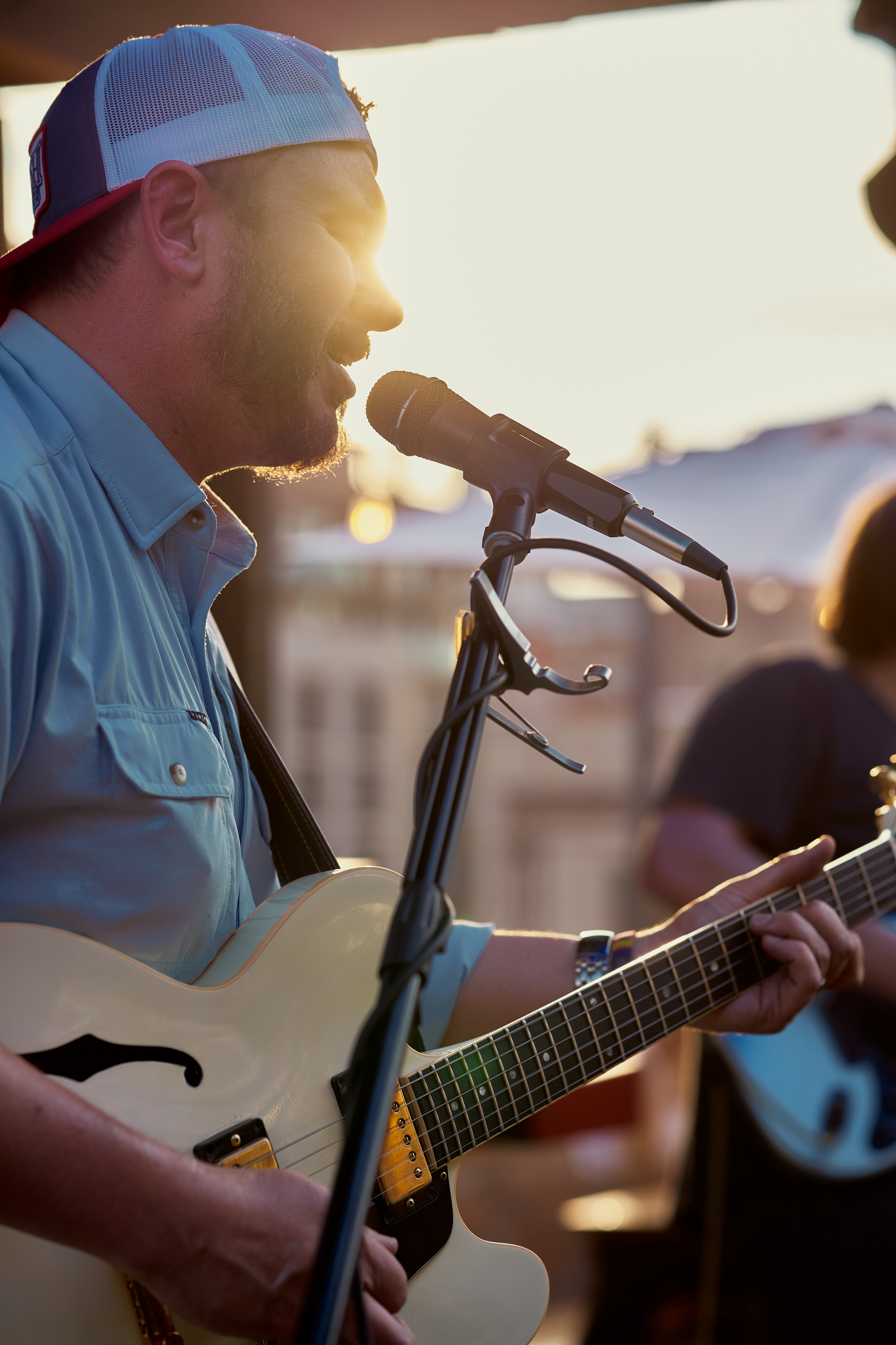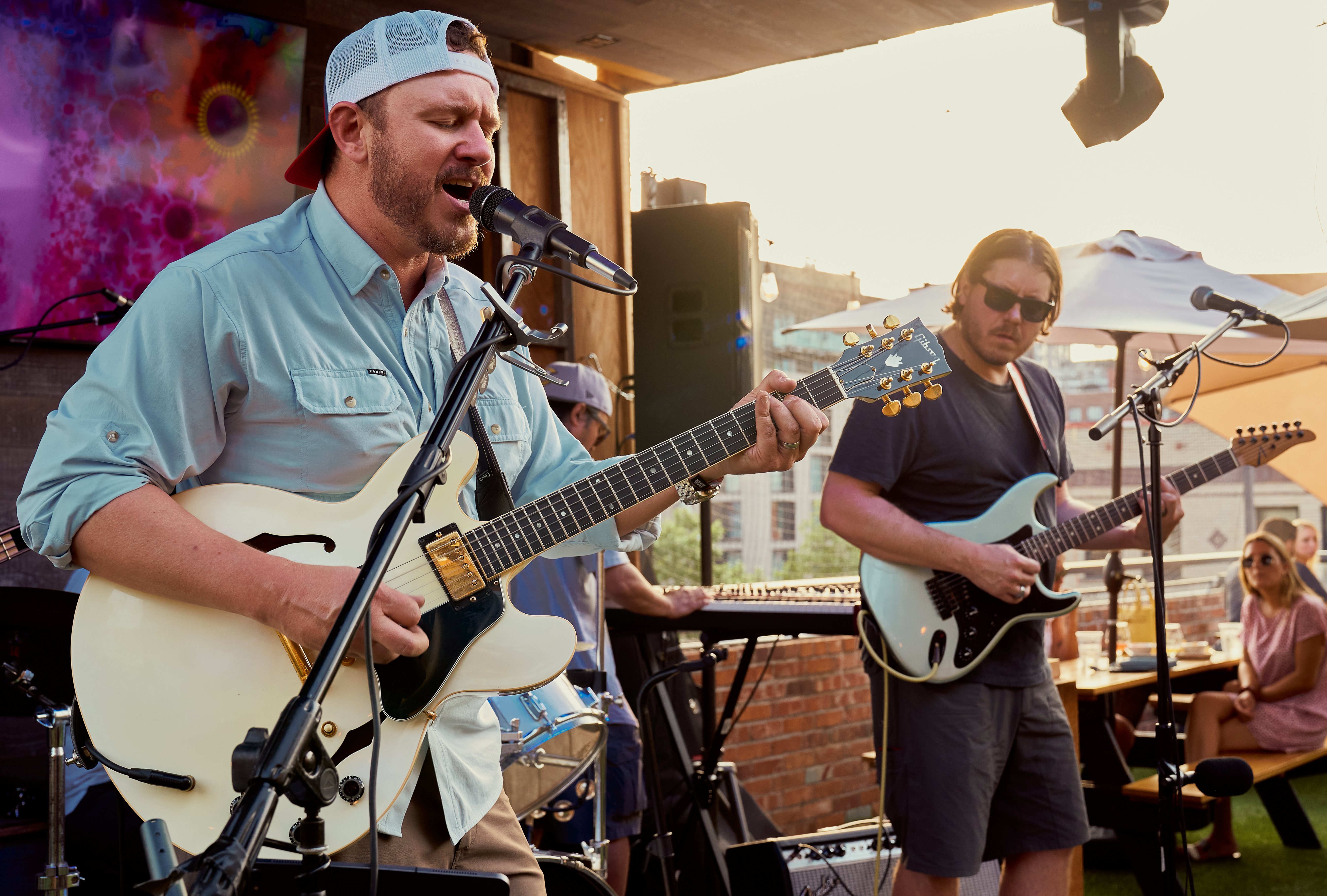 Beyond friendship, he is also my go-to guy for everything guitar. This guy knows his pedals and rigs! So Wednesday night at downtown Lodo bar Tap Fourteen – Rooftop Beer Garden, it came as no surprise to see lots of pedals on the stage. Joined by Matthew Norcross on guitar, Chuck Obmaces on keys, David Simutis on bass and Matt Fisher on drums, Stocks has a big sound that draws heavily on 90’s grunge influences.